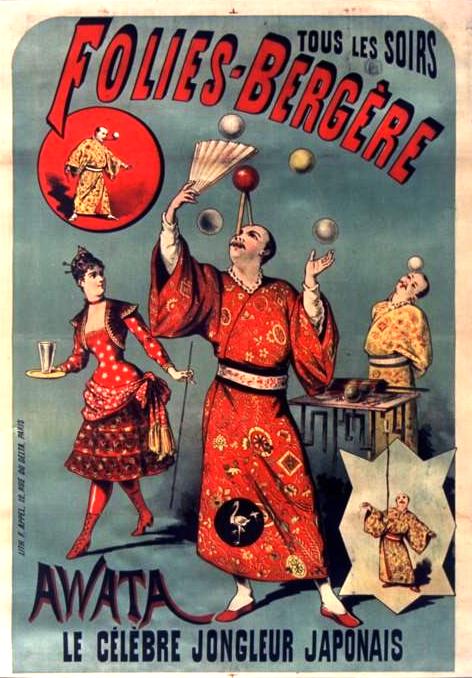1889 February – advertisement in The Era by agents Parravicini, that Katsnoshin Awatata, Japanese court juggler, has been engaged for a continental tour.