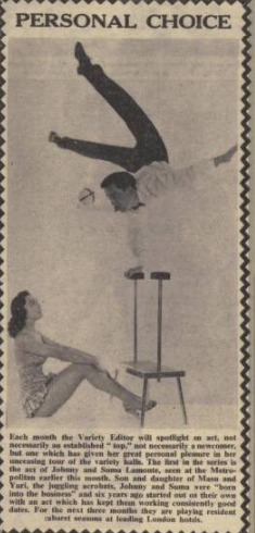 From there they go to the Biombo Chino in Madrid, and this is to be followed by engagement at the Sporting Club, Monte Carlo, and the Casino, Cannes. Johnny and Suma have done a small amount of Continental work in the past but not to any great extent, but it now looks as if they may be doing quite a sequence.