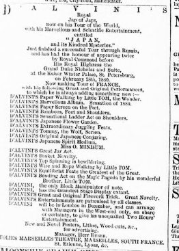 1876 January – D’Alvini, the Imperial Japanese in Scotland. New Oriental and Japanese entertainer and Great Block Manipulator, late principal of Tannaker’s troupe. 16 Canal Road Hoxton.