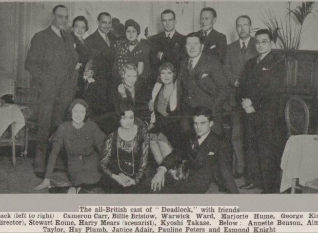 1932 Takase is Taki in Deadlock directed by George King. The story of murder in a film studio during the shooting of a picture. The truth is, of course, finally revealed by the camera.