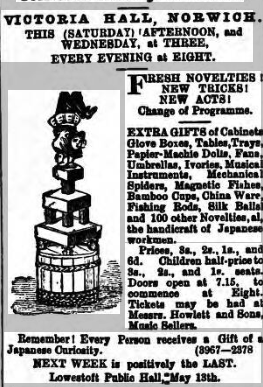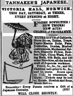 1877 December – Tannaker’s Japanese New Entertainment in Bristol Colston Hall – 11 male and female artists “far exceeding anything that has visited Bristol before” Christmas box and New Year’s gift to every patron present consisting of boxes, fans, Japanese tables, mechanical figures, spiders, paper umbrellas, large cabinets, china ware, fishing rods, silk balls and 100 other novelty donations, curiosities etc all of the handicraft of Japanese workmen, and made in Japan.