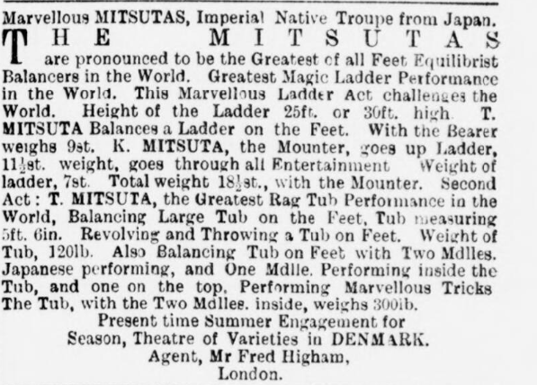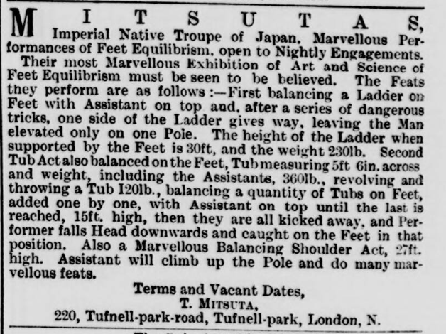 1897 September – Imperial Native Troupe of Japan MITSUTA JAPANESE TROUPE. The most Marvellous Performances of Feet Equilibrists, manipulating the most incongruous Objects with a facility that astonishes the beholder. Exhibition of Art and Science of Feet Equilibrism. At Liberty Oct. 4th, Nov. 8th, 15th, 22d, 29th, Dec. 6th, 13th, 20th. Also Liberty for Pantomime, January, 1898. All communications, T. MITSUTA, 11, Poynings-road, London, N.